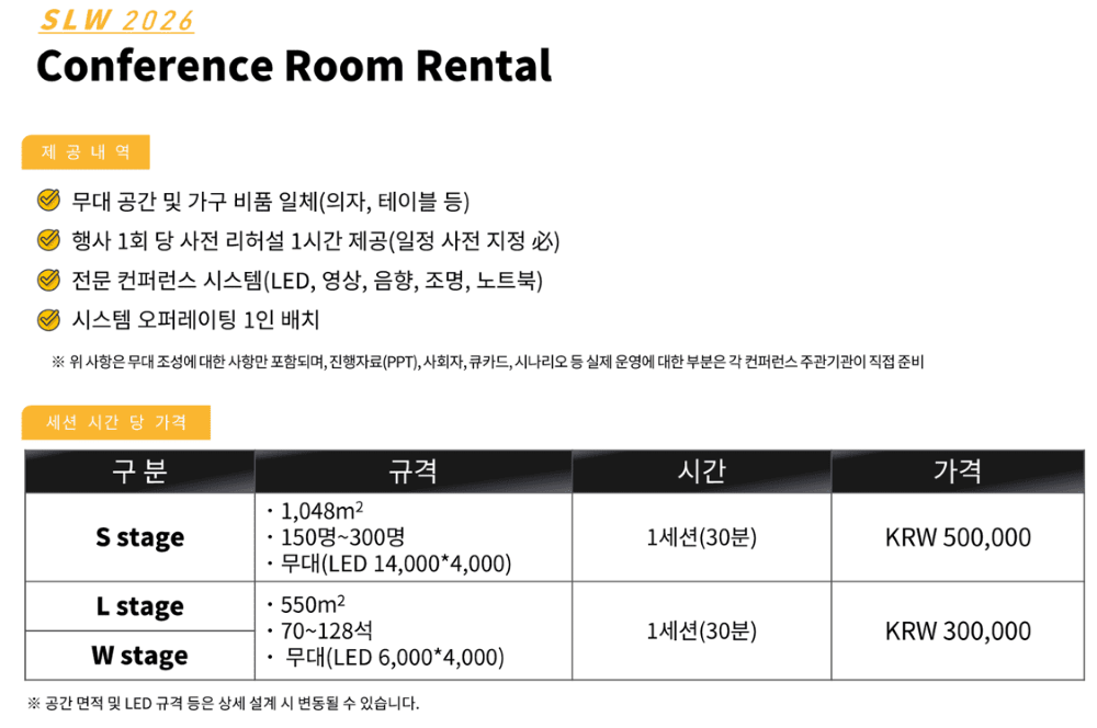 전시 부스 운영, 스폰서십 모집, 컨퍼런스룸 대여를 아래와 같이 진행하오니, 많은 관심과 참여를 바랍니다.